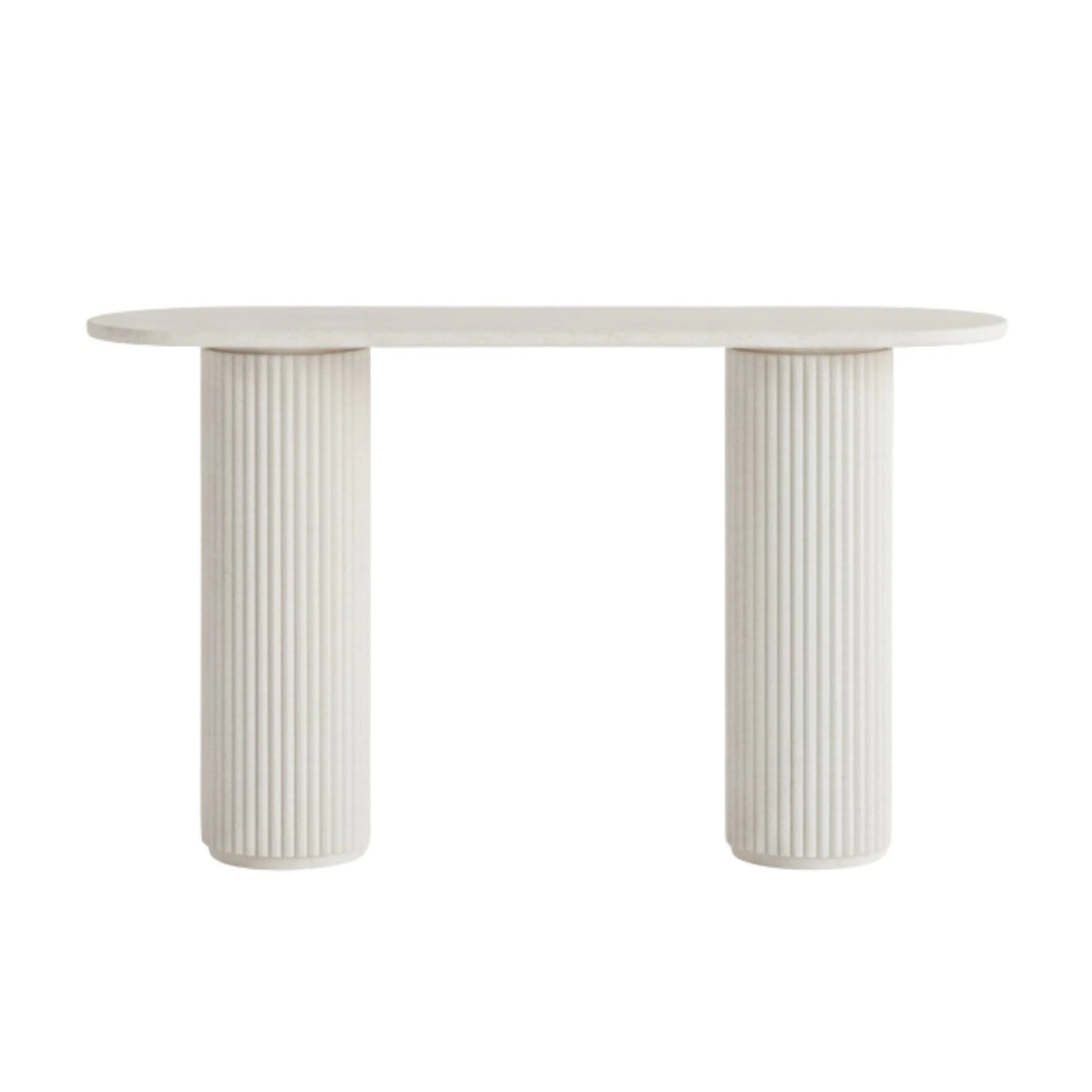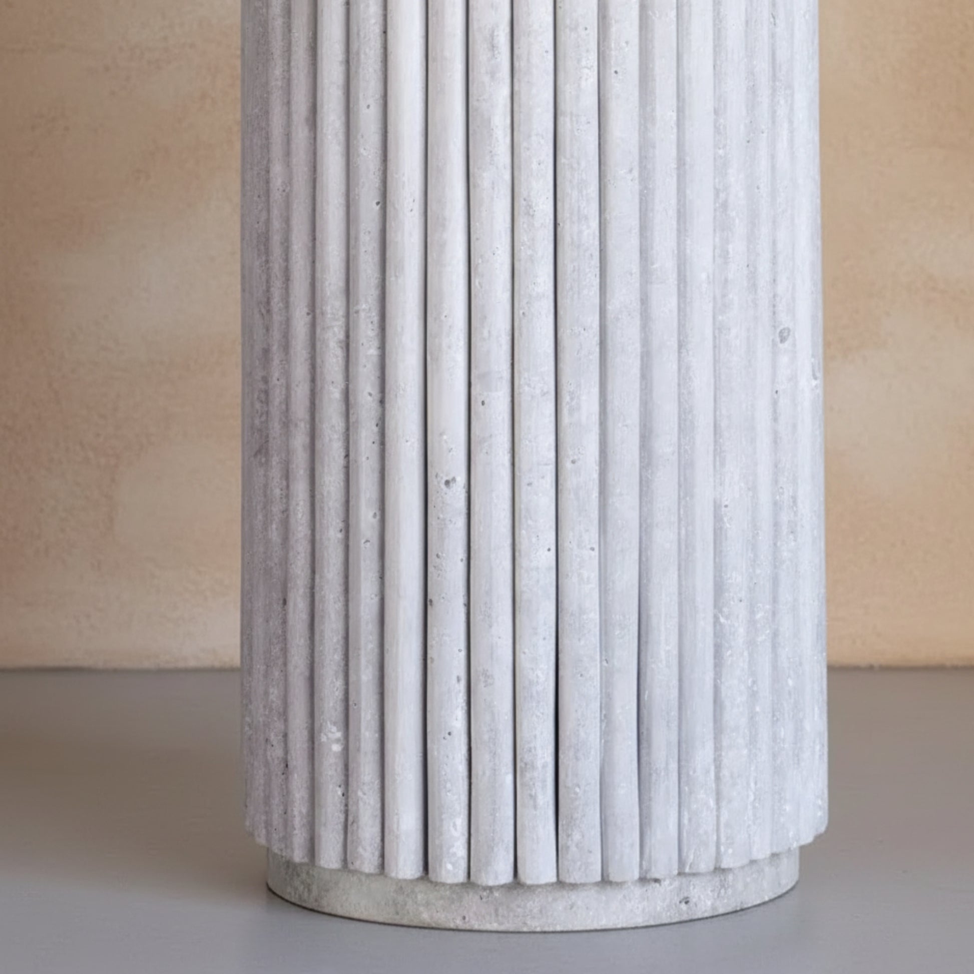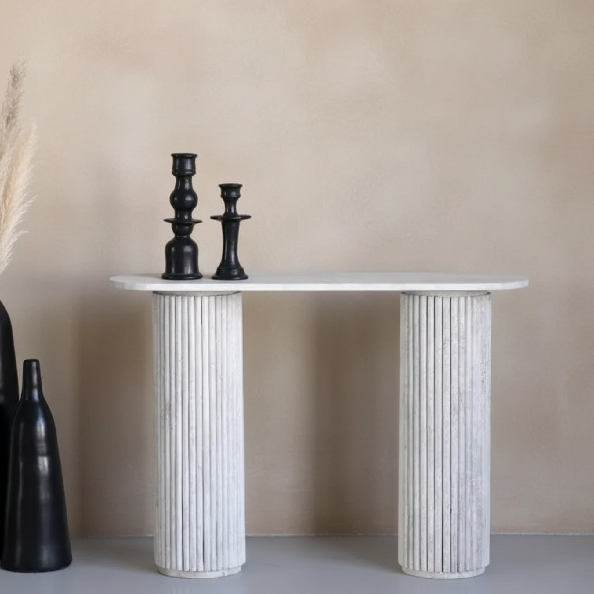 Les colonnes striées apportent une touche architecturale subtile, tandis que le plateau lisse offre un espace parfait pour exposer vos objets décoratifs, vases ou bougies.
