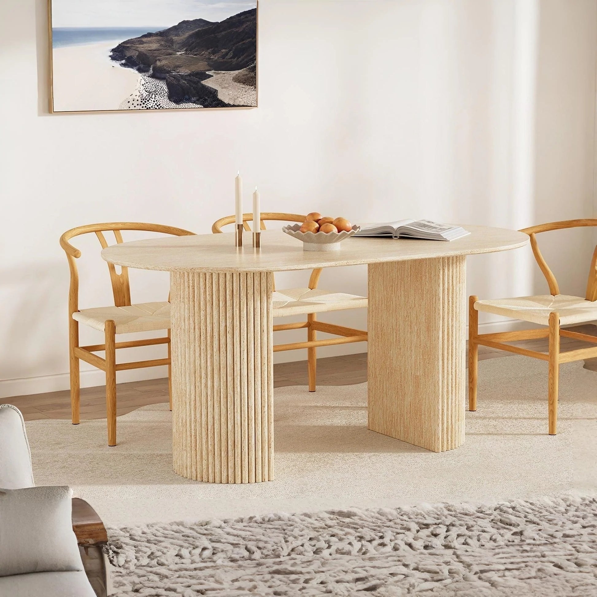 La Table Ovale Nina en travertin naturel incarne l’équilibre parfait entre raffinement et authenticité.